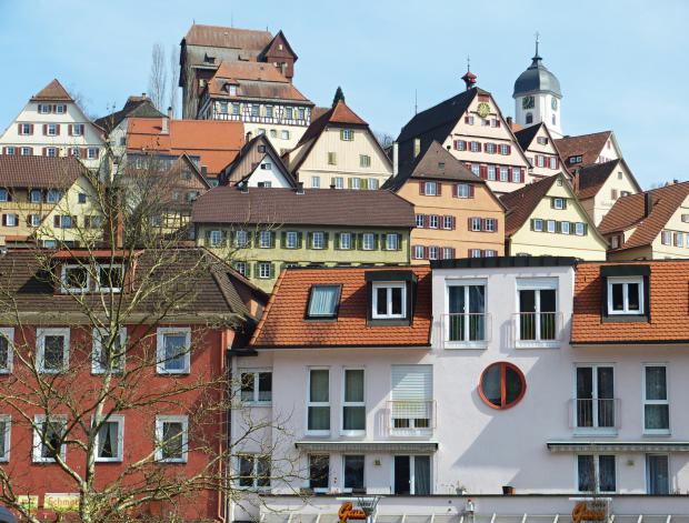 Pohled na město Altensteig, stojící ve strmé stráni nad řekou Nagold. Vlevo vykukuje zámek, vpravo evangelický městský kostel.