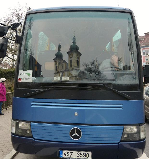 Autobus pana Čoudka, v čelním skle se odráží katolický farní kostel