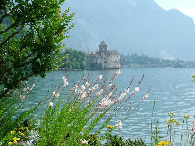 Pohled na hrad Chillon ze břehu Ženevského jezera