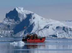 5.den: přelet na západní pobřeží Grónska do Ilulissatu, večer plavba lodí fjordem k ledovci, kde se odlamují kry. N