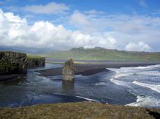 2.den: jižní pobřeží: sopka Hekla, vodopády Seljalandsfoss a Skógafoss. Nejjižnější mys Islandu Dýrholaey (skalní brána), černá sopečná pláž u Víku, splaz ledovce Sólheimajökull. N