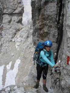 3. den: celodenní výstup zajištěnou cestou (ferátou) Degli Alleghesi na vrchol Civetty (3 220 m) a následný sestup ferátou Tissi na chatu Vazzoler (1 714 m). Pro méně zkušené možná varianta přechodu úbočím Civetty. N